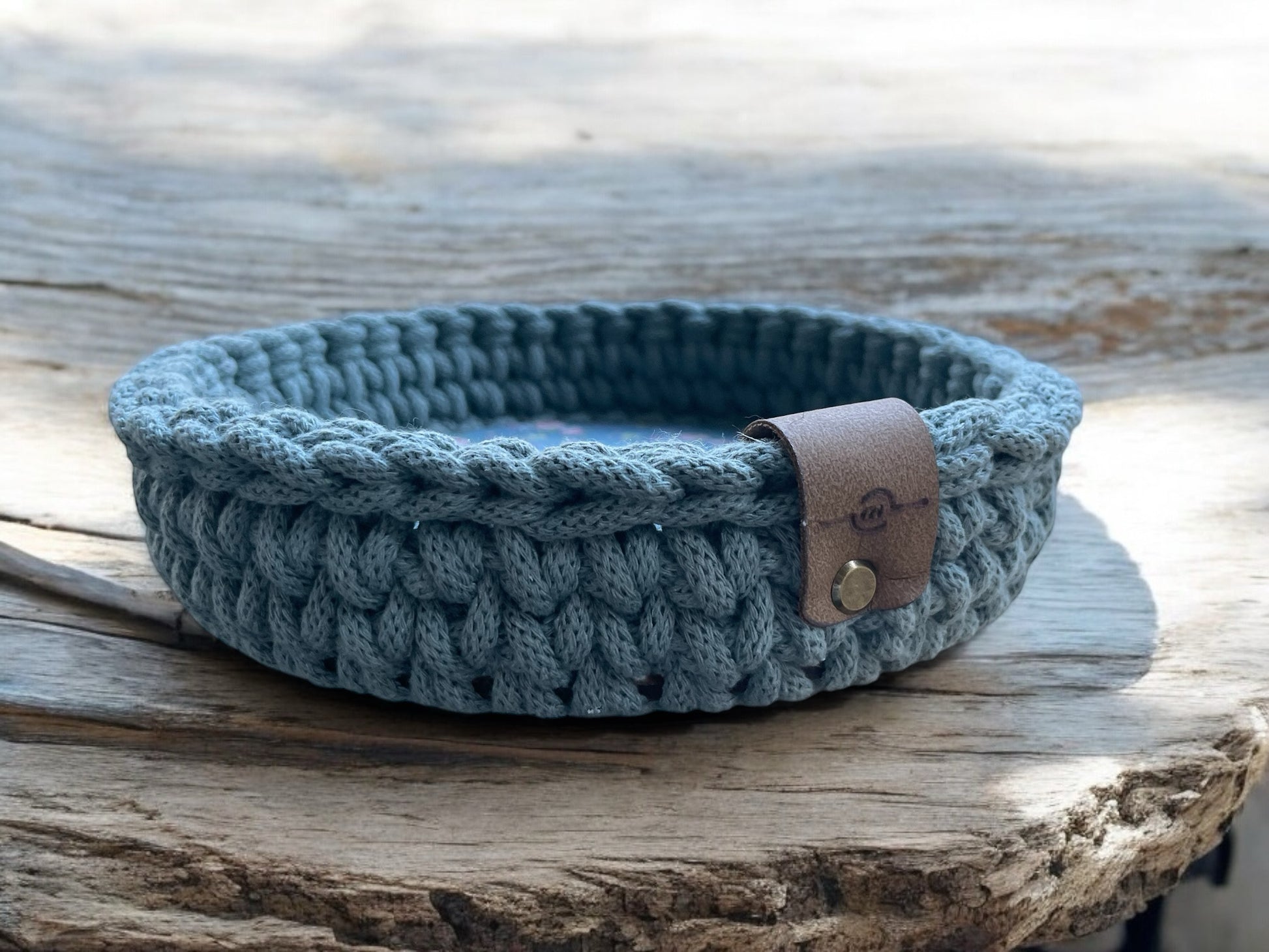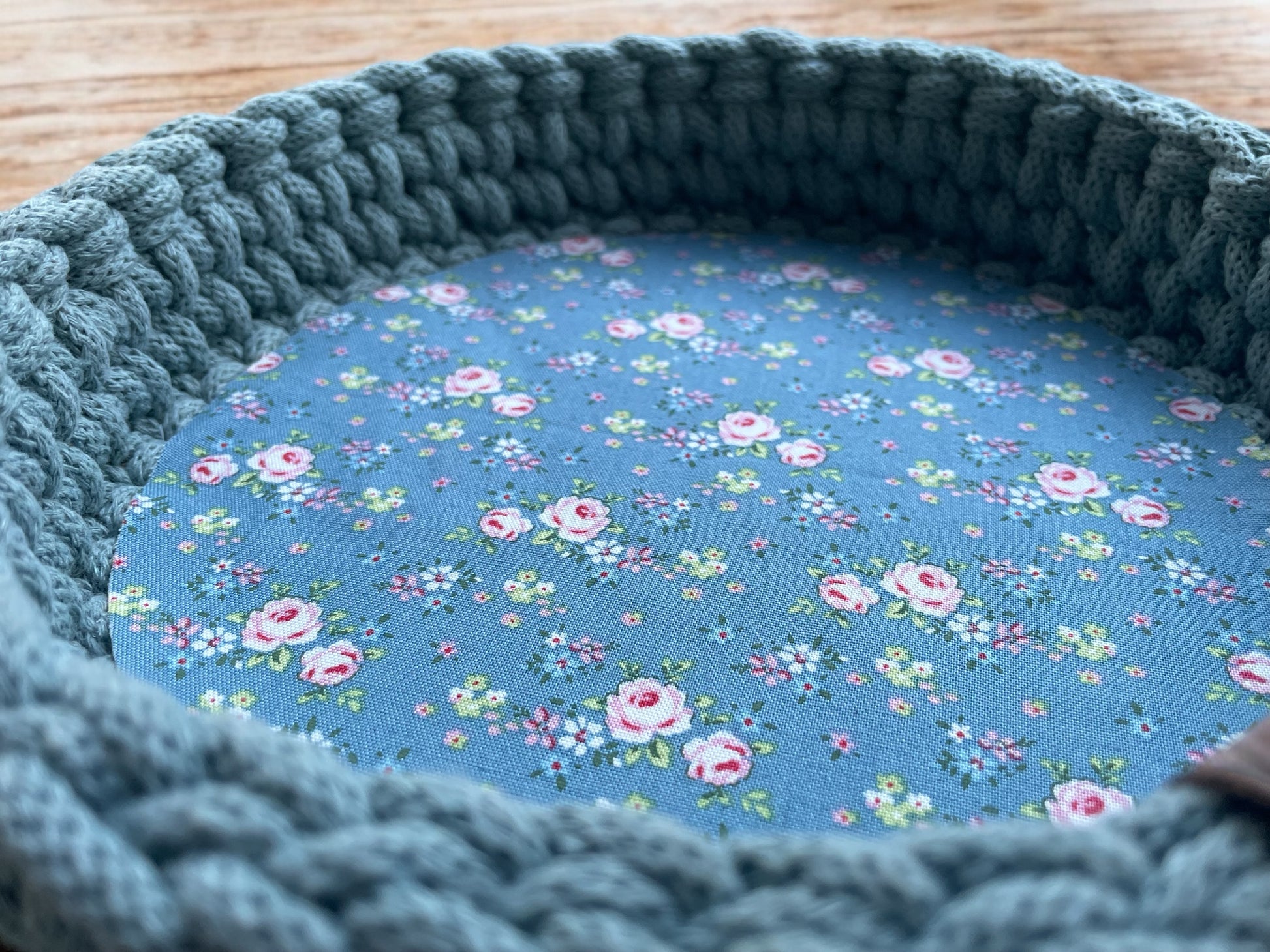 Beautifully crafted crochet basket with 100% pure braided cotton. Laser cut white base with liberty fabric to the inside of the basket.